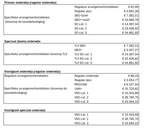 We bekostigen leerlingen op basis van ondersteuningsvraag en financieren groepsgericht. De school ontvangt de arrangementsmiddelen. Afhankelijk van de ondersteuningsvraag en het aanbod ontvangt de school specifieke arrangementsmiddelen. Bij opstart van een nieuw arrangement ontvangt de school een stimuleringsbijdrage à € 10.000.